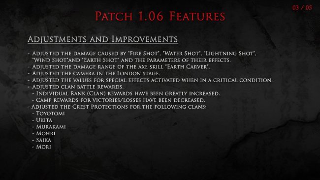 Nioh's Facebook page posted extensive patch notes for the game in picture format, which we've included below, but other changes include new smithing texts, sub missions, and titles. Is pausing the main feature though?