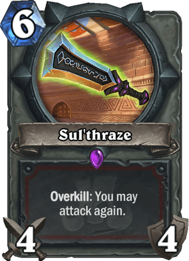 There's a new game mechanic, Overkill, found here. Cards with this mechanic will trigger additional effects if they cause more damage to a minion than you would need in order to kill it. Sul'Tharze, a new warrior 4/4 weapon with Overkill, was used as an example, and it will allow you to attack again if you kill a minion that has 3 or less health (meaning you caused more damage than you would need to).